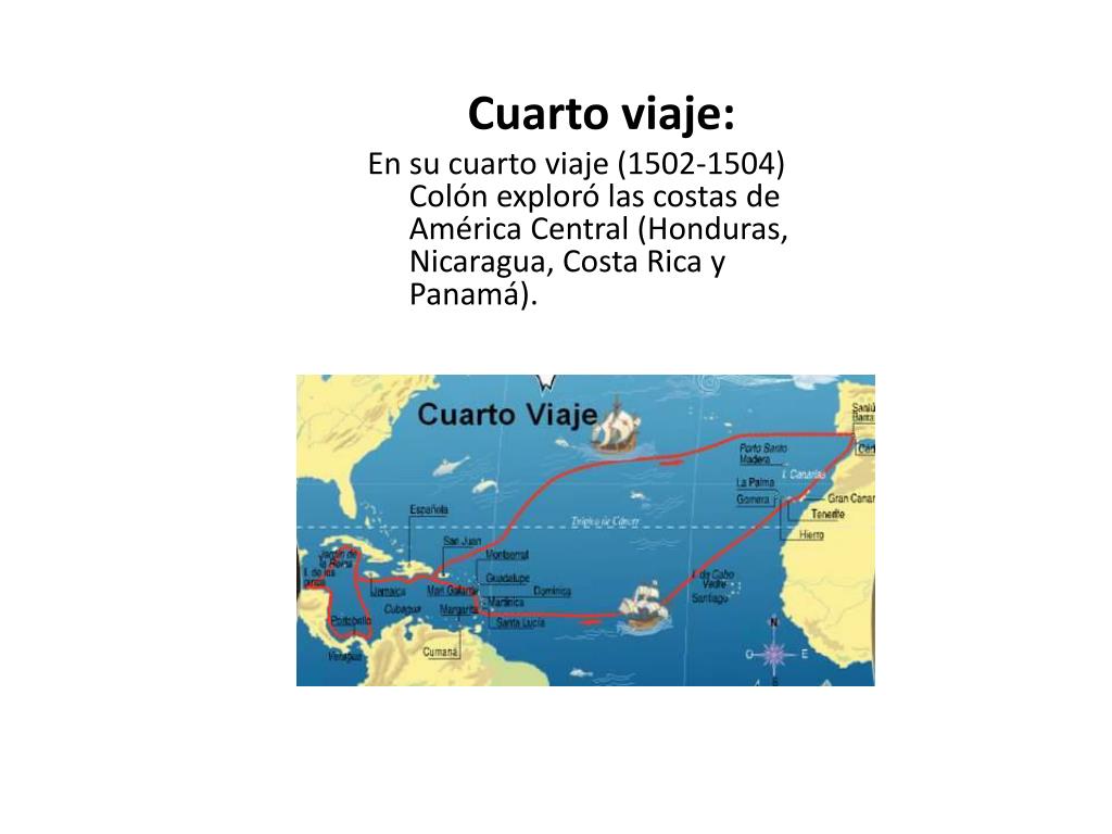 Cuarto viaje: En su cuarto viaje (1502-1504) Colón exploró las costas de América Central (Honduras, Nicaragua, Costa Rica y Panamá).