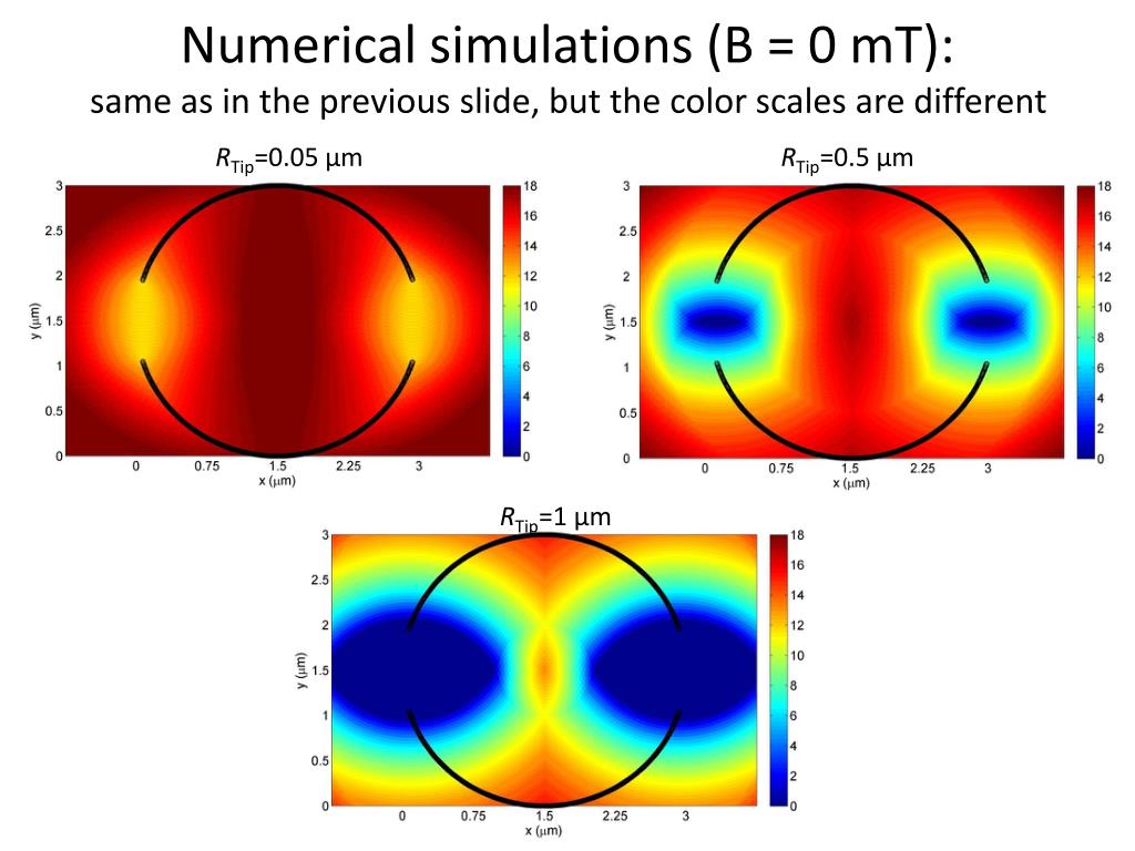 Numerical simulations (B = 0 mT):same as in the previous slide, but the color scales are different RTip=0.05 µm RTip=0.5 µm RTip=1 µm