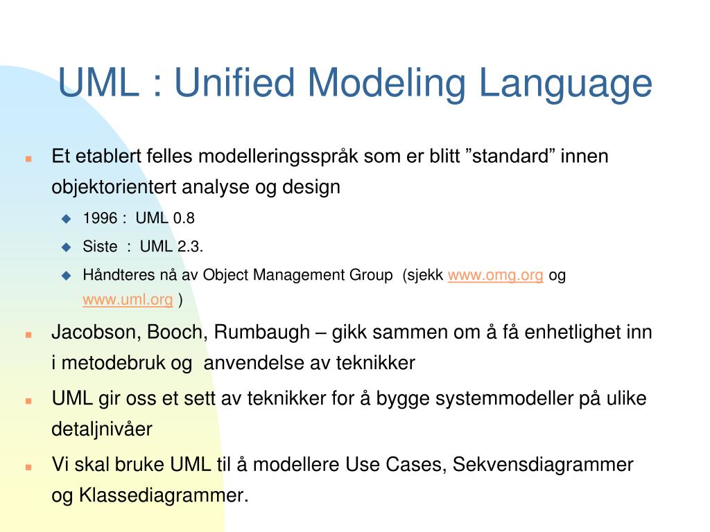 UML : Unified Modeling Language • Et etablert felles modelleringsspråk som er blitt ”standard” innen objektorientert analyse og design • 1996 : UML 0.8 • Siste : UML 2.3. • Håndteres nå av Object Management Group (sjekk www.omg.org og www.uml.org ) • Jacobson, Booch, Rumbaugh – gikk sammen om å få enhetlighet inn i metodebruk og anvendelse av teknikker • UML gir oss et sett av teknikker for å bygge systemmodeller på ulike detaljnivåer • Vi skal bruke UML til å modellere Use Cases, Sekvensdiagrammer og Klassediagrammer.