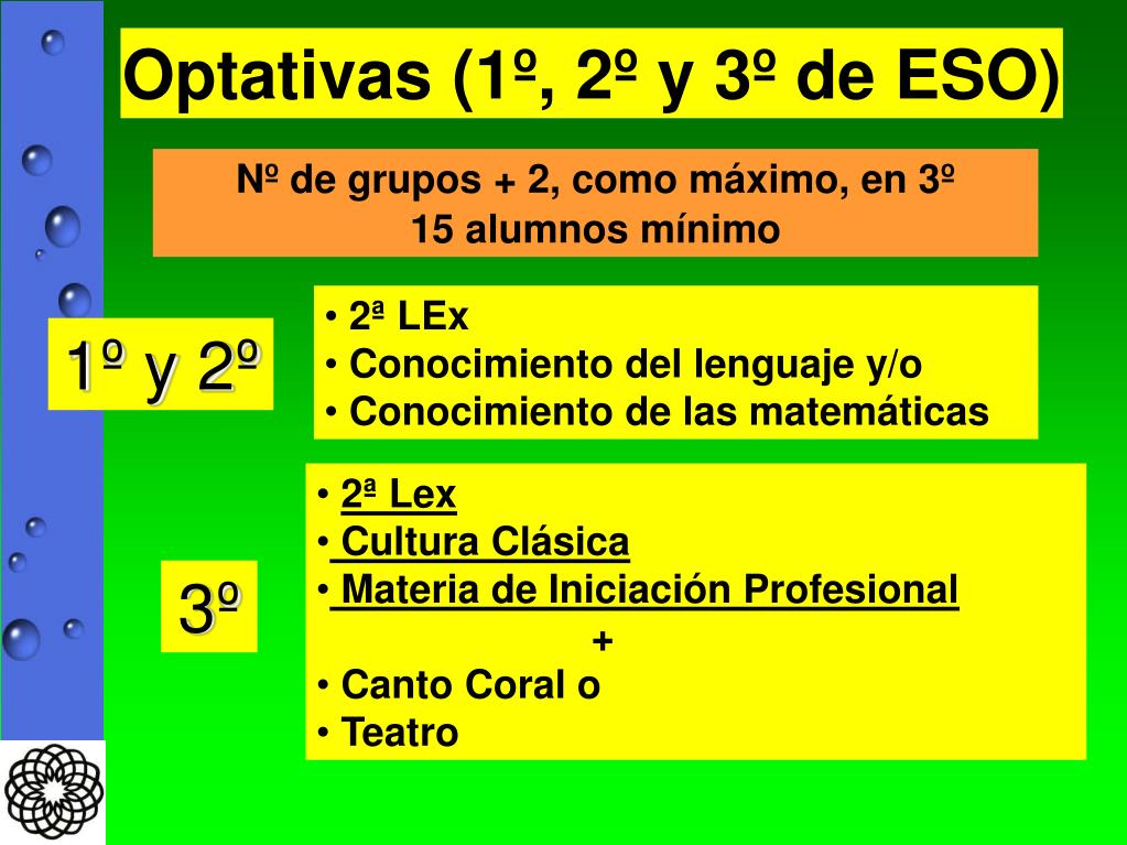 Optativas (1º, 2º y 3º de ESO) Nº de grupos + 2, como máximo, en 3º 15 alumnos mínimo • 2ª LEx • Conocimiento del lenguaje y/o • Conocimiento de las matemáticas 1º y 2º • 2ª Lex • Cultura Clásica • Materia de Iniciación Profesional • + • Canto Coral o • Teatro 3º