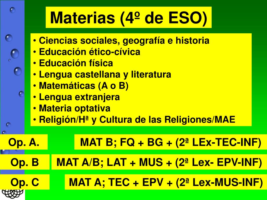 Materias (4º de ESO) • Ciencias sociales, geografía e historia • Educación ético-cívica • Educación física • Lengua castellana y literatura • Matemáticas (A o B) • Lengua extranjera • Materia optativa • Religión/Hª y Cultura de las Religiones/MAE Op. A. MAT B; FQ + BG + (2ª LEx-TEC-INF) MAT A/B; LAT + MUS + (2ª Lex- EPV-INF) Op. B Op. C MAT A; TEC + EPV + (2ª Lex-MUS-INF)