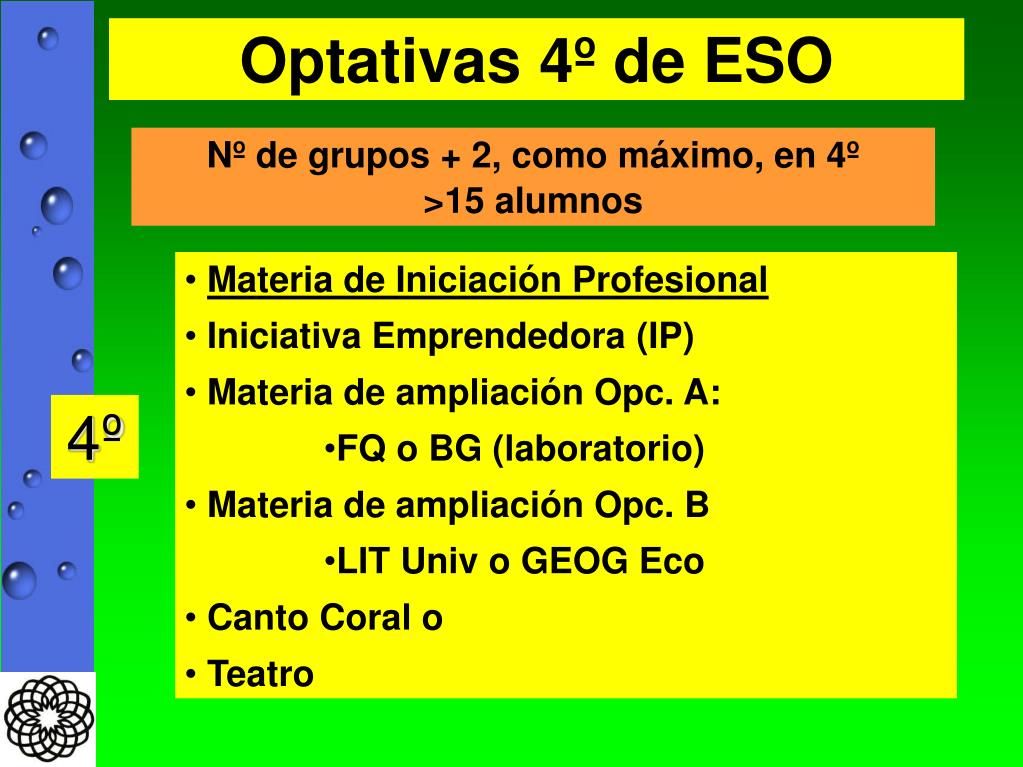 Optativas 4º de ESO Nº de grupos + 2, como máximo, en 4º >15 alumnos • Materia de Iniciación Profesional • Iniciativa Emprendedora (IP) • Materia de ampliación Opc. A: • FQ o BG (laboratorio) • Materia de ampliación Opc. B • LIT Univ o GEOG Eco • Canto Coral o • Teatro 4º