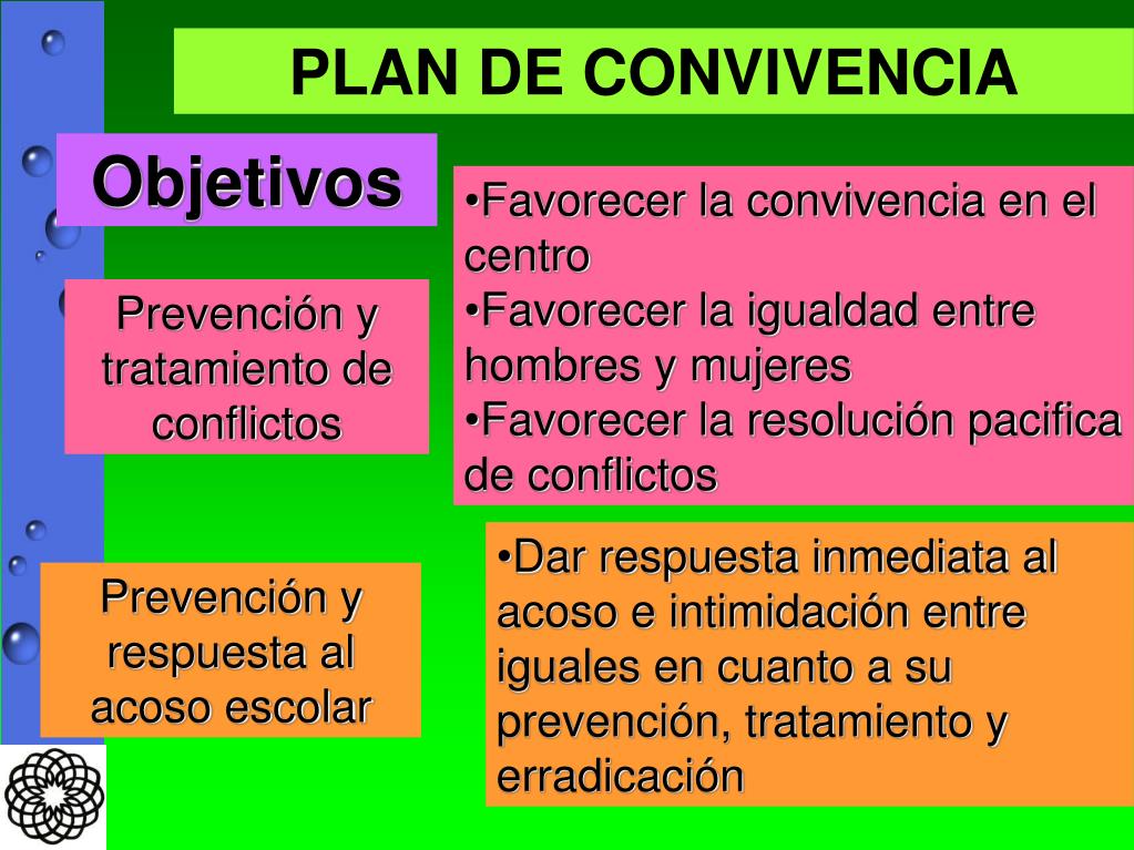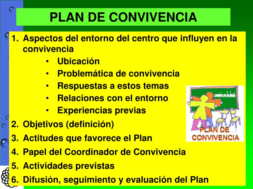 Plan de convivencia • Descripción de los aspectos del entorno del centro que influyen en la convivencia. • Objetivos a conseguir y actitudes que pretende favorecer el plan. • Actividades previstas para la consecución de los objetivos. • Mecanismos para la difusión, seguimiento y evaluación del plan.