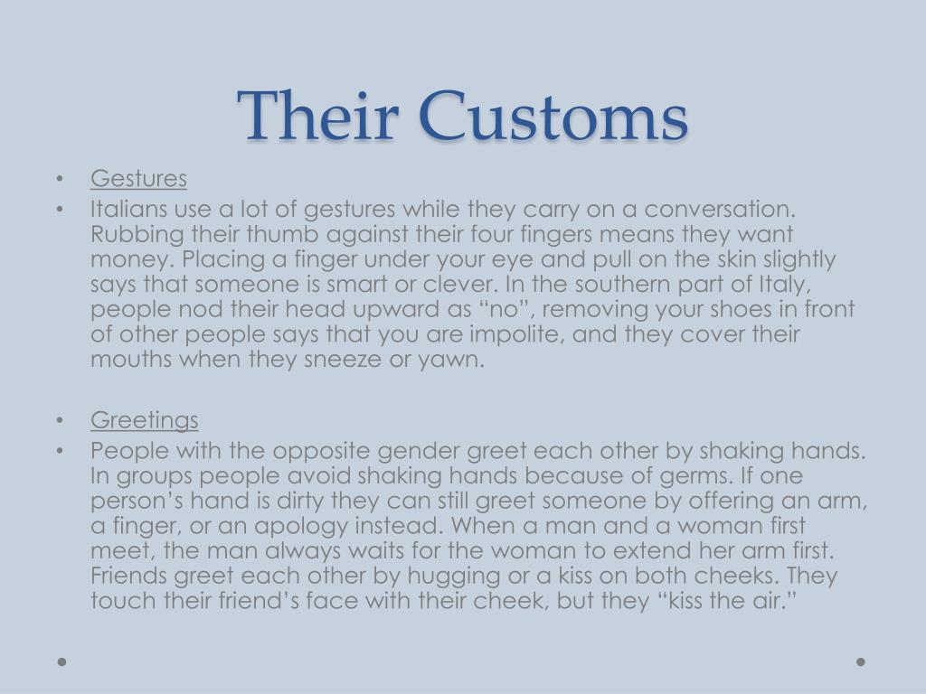 Their Customs • Gestures • Italians use a lot of gestures while they carry on a conversation. Rubbing their thumb against their four fingers means they want money. Placing a finger under your eye and pull on the skin slightly says that someone is smart or clever. In the southern part of Italy, people nod their head upward as “no”, removing your shoes in front of other people says that you are impolite, and they cover their mouths when they sneeze or yawn. • Greetings • People with the opposite gender greet each other by shaking hands. In groups people avoid shaking hands because of germs. If one person’s hand is dirty they can still greet someone by offering an arm, a finger, or an apology instead. When a man and a woman first meet, the man always waits for the woman to extend her arm first. Friends greet each other by hugging or a kiss on both cheeks. They touch their friend’s face with their cheek, but they “kiss the air.”