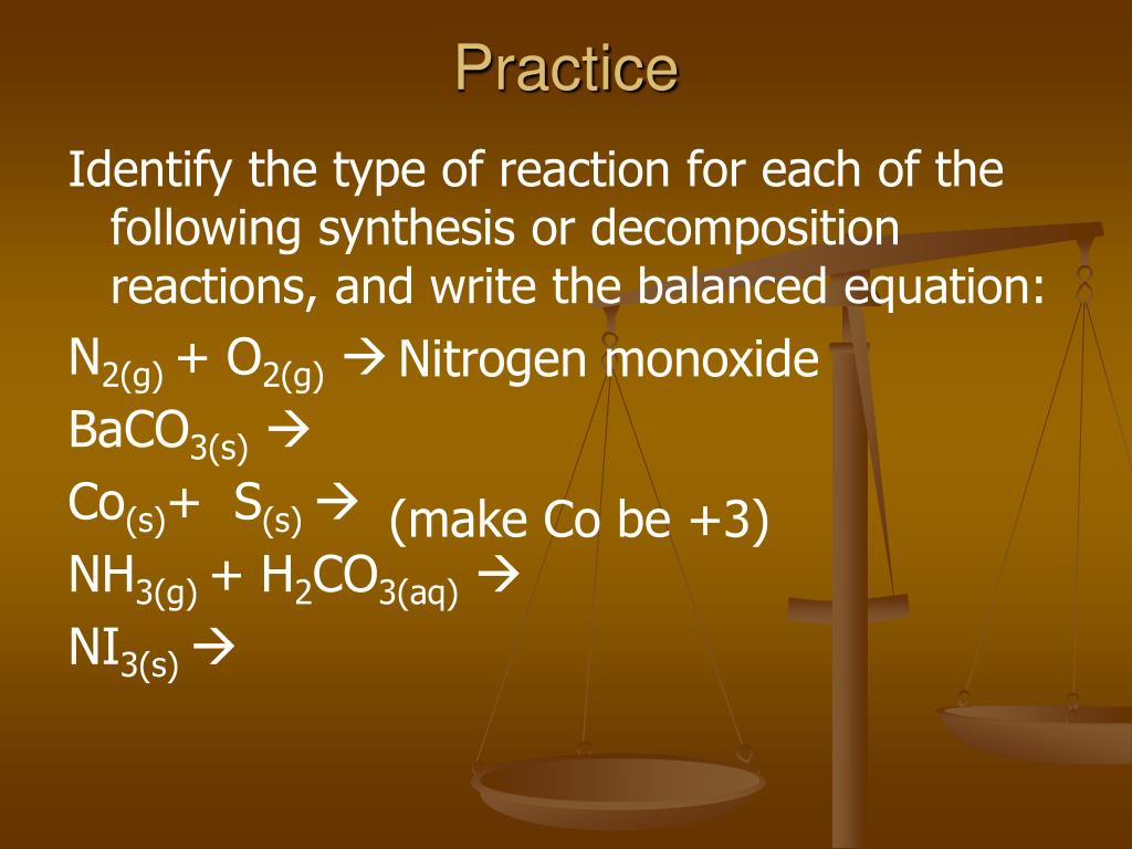 Practice Identify the type of reaction for each of the following synthesis or decomposition reactions, and write the balanced equation: N2(g) + O2(g) BaCO3(s) Co(s)+ S(s) NH3(g) + H2CO3(aq) NI3(s) Nitrogen monoxide (make Co be +3)