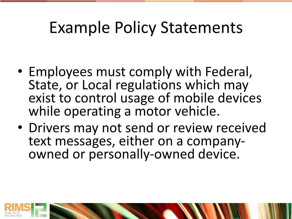 Example Policy Statements • Employees must comply with Federal, State, or Local regulations which may exist to control usage of mobile devices while operating a motor vehicle. • Drivers may not send or review received text messages, either on a company-owned or personally-owned device.