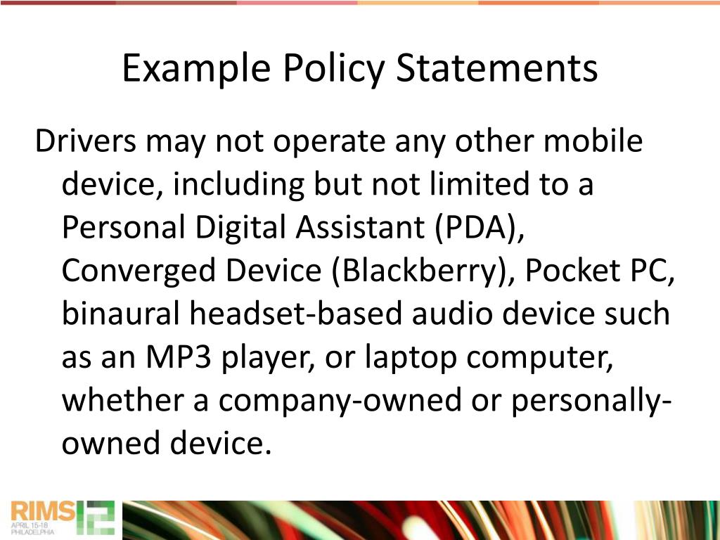 Example Policy Statements Drivers may not operate any other mobile device, including but not limited to a Personal Digital Assistant (PDA), Converged Device (Blackberry), Pocket PC, binaural headset-based audio device such as an MP3 player, or laptop computer, whether a company-owned or personally-owned device.