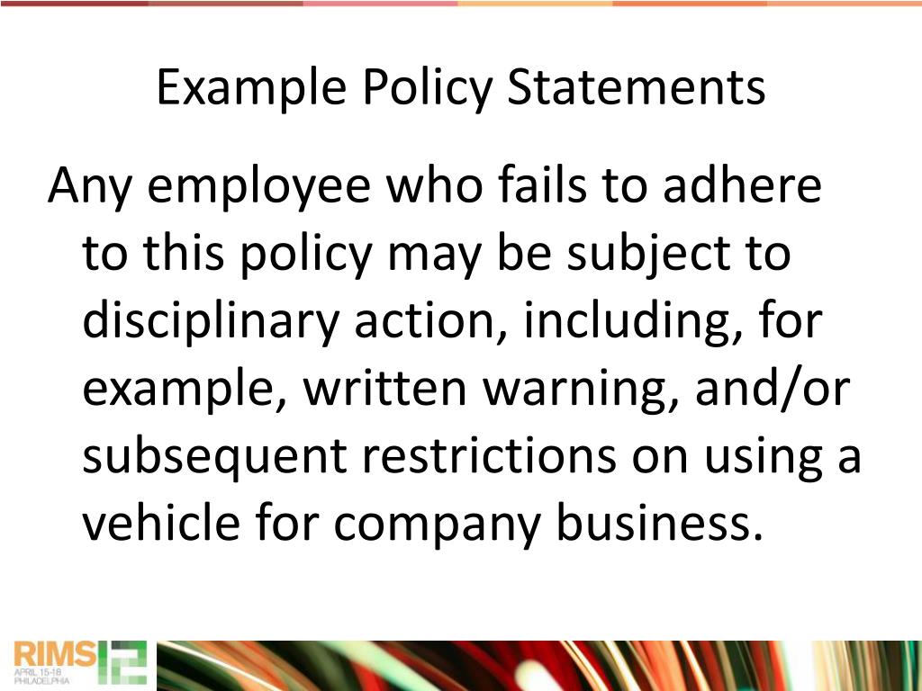 Example Policy Statements Any employee who fails to adhere to this policy may be subject to disciplinary action, including, for example, written warning, and/or subsequent restrictions on using a vehicle for company business.