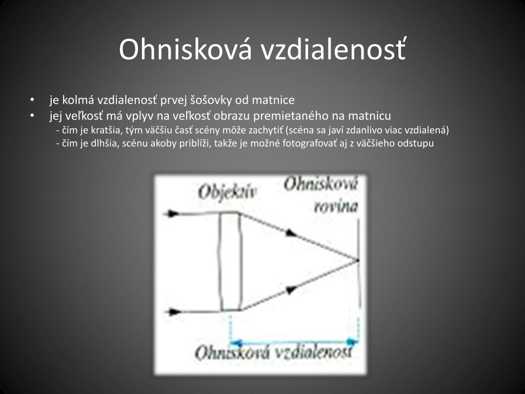 Ohnisková vzdialenosť • je kolmá vzdialenosť prvej šošovky od matnice • jej veľkosť má vplyv na veľkosť obrazu premietaného na matnicu - čím je kratšia, tým väčšiu časť scény môže zachytiť (scéna sa javí zdanlivo viac vzdialená) - čím je dlhšia, scénu akoby priblíži, takže je možné fotografovať aj z väčšieho odstupu