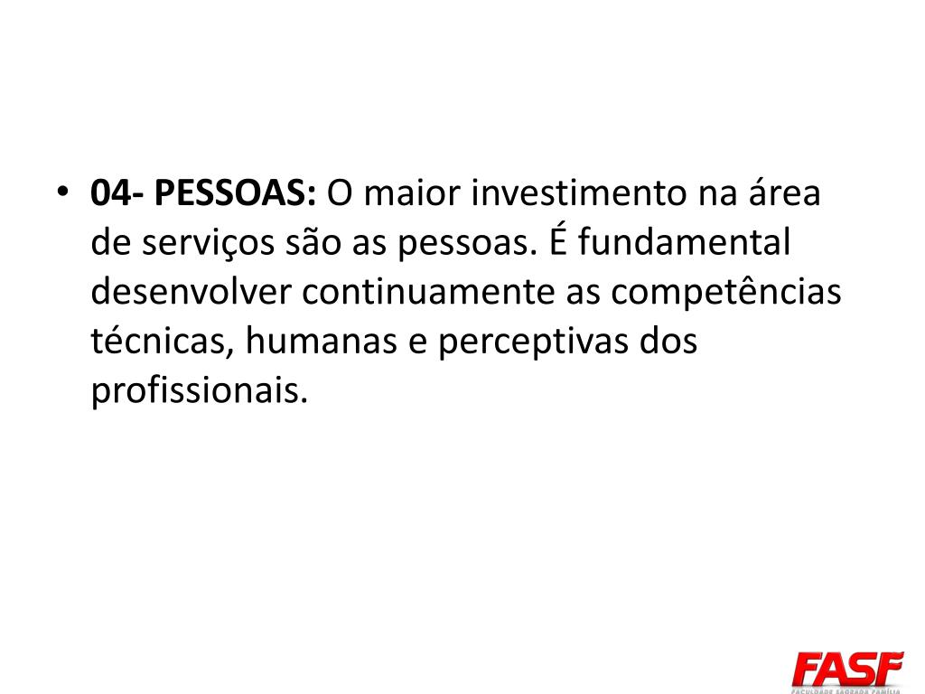 04- PESSOAS: O maiorinvestimentonaárea de serviçossão as pessoas. É fundamental desenvolvercontinuamente as competênciastécnicas, humanas e perceptivas dos profissionais.