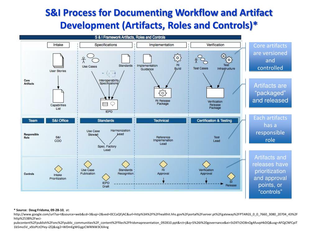 S&I Process for Documenting Workflow and Artifact Development (Artifacts, Roles and Controls)* Core artifacts are versioned and controlled Artifacts are “packaged” and released Each artifacts has a responsible role Artifacts and releases have prioritization and approval points, or “controls” * Source: Doug Fridsma, 09-28-10, at: http://www.google.com/url?sa=t&source=web&cd=3&sqi=2&ved=0CCoQFjAC&url=http%3A%2F%2Fhealthit.hhs.gov%2Fportal%2Fserver.pt%2Fgateway%2FPTARGS_0_0_7660_3080_20704_43%2Fhttp%253B%2Fwci-pubcontent%2Fpublish%2Fonc%2Fpublic_communities%2F_content%2Ffiles%2Ffridsmapresentation_092810.ppt&rct=j&q=S%26I%20governance&ei=StZ4Tt2IO8nOgAfuvpHkDQ&usg=AFQjCNFCpiT1b5mo5V_x9JzPLtOYey-iZQ&sig2=WDmEgWGygzCWlKNW3CKAng