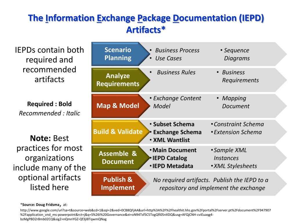 The Information Exchange Package Documentation (IEPD) Artifacts* IEPDs contain both required and recommended artifacts Required : Bold Recommended : Italic Note: Best practices for most organizations include many of the optional artifacts listed here Scenario Planning • Business Process • Use Cases • Sequence Diagrams Analyze Requirements • Business Rules • Business Requirements Map & Model • Exchange Content Model • Mapping Document Build & Validate • Subset Schema • Exchange Schema • XML Wantlist • Constraint Schema • Extension Schema • Main Document • IEPD Catalog • IEPD Metadata • Sample XML Instances • XML Stylesheets Assemble & Document No required artifacts. Publish the IEPD to a repository and implement the exchange Publish & Implement *Source: Doug Fridsma, at: http://www.google.com/url?sa=t&source=web&cd=1&sqi=2&ved=0CB8QFjAA&url=http%3A%2F%2Fhealthit.hhs.gov%2Fportal%2Fserver.pt%2Fdocument%2F947907%2Fapplication_vnd_ms-powerpoint&rct=j&q=S%26I%20Governance&ei=oN94Tsf5C5TogQfI05nXDQ&usg=AFQjCNH-cviEuaqg4-bzMgPBD2r8mb02CQ&sig2=nQmnYGZ-Qf3jI8TqwmQNag