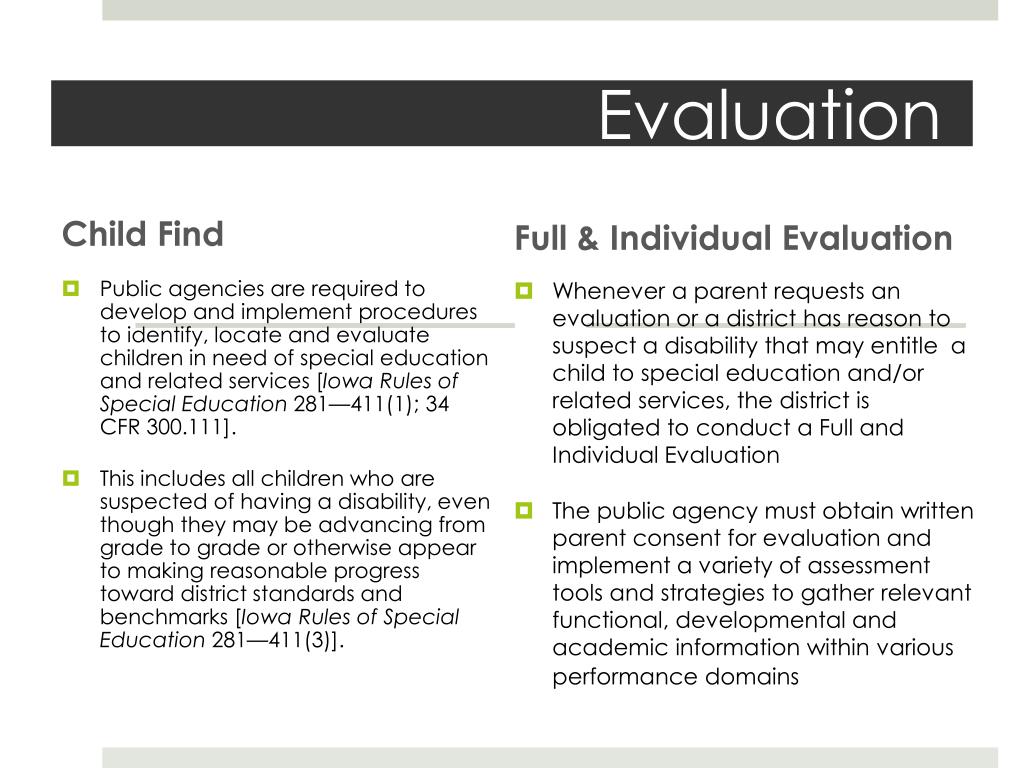 Evaluation Child Find Full & Individual Evaluation Whenever a parent requests an evaluation or a district has reason to suspect a disability that may entitle a child to special education and/or related services, the district is obligated to conduct a Full and Individual Evaluation The public agency must obtain written parent consent for evaluation and implement a variety of assessment tools and strategies to gather relevant functional, developmental and academic information within various performance domains • Public agencies are required to develop and implement procedures to identify, locate and evaluate children in need of special education and related services [Iowa Rules of Special Education 281—411(1); 34 CFR 300.111]. • This includes all children who are suspected of having a disability, even though they may be advancing from grade to grade or otherwise appear to making reasonable progress toward district standards and benchmarks [Iowa Rules of Special Education 281—411(3)].