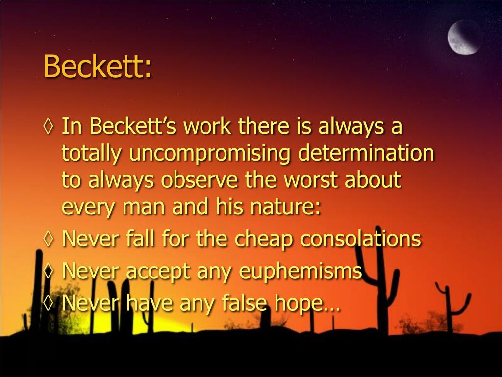 Beckett: • In Beckett’s work there is always a totally uncompromising determination to always observe the worst about every man and his nature: • Never fall for the cheap consolations • Never accept any euphemisms • Never have any false hope…