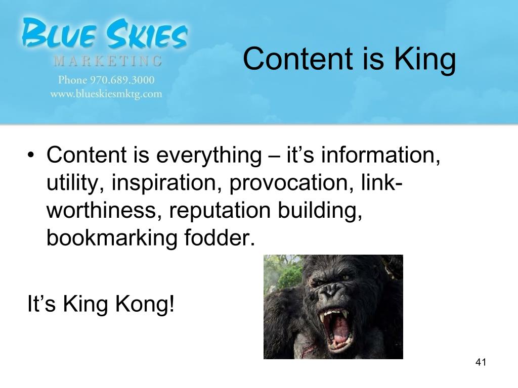 Content is King • Content is everything – it’s information, utility, inspiration, provocation, link-worthiness, reputation building, bookmarking fodder. It’s King Kong!