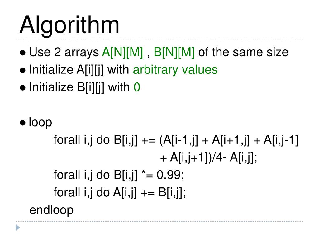 Algorithm • Use 2 arrays A[N][M] , B[N][M] of the same size • Initialize A[i][j] with arbitrary values • Initialize B[i][j] with 0 • loop forall i,j do B[i,j] += (A[i-1,j] + A[i+1,j] + A[i,j-1] + A[i,j+1])/4- A[i,j]; forall i,j do B[i,j] *= 0.99; forall i,j do A[i,j] += B[i,j]; endloop