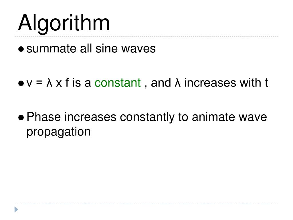 Algorithm • summate all sine waves • v = λ x f is a constant , and λ increases with t • Phase increases constantly to animate wave propagation