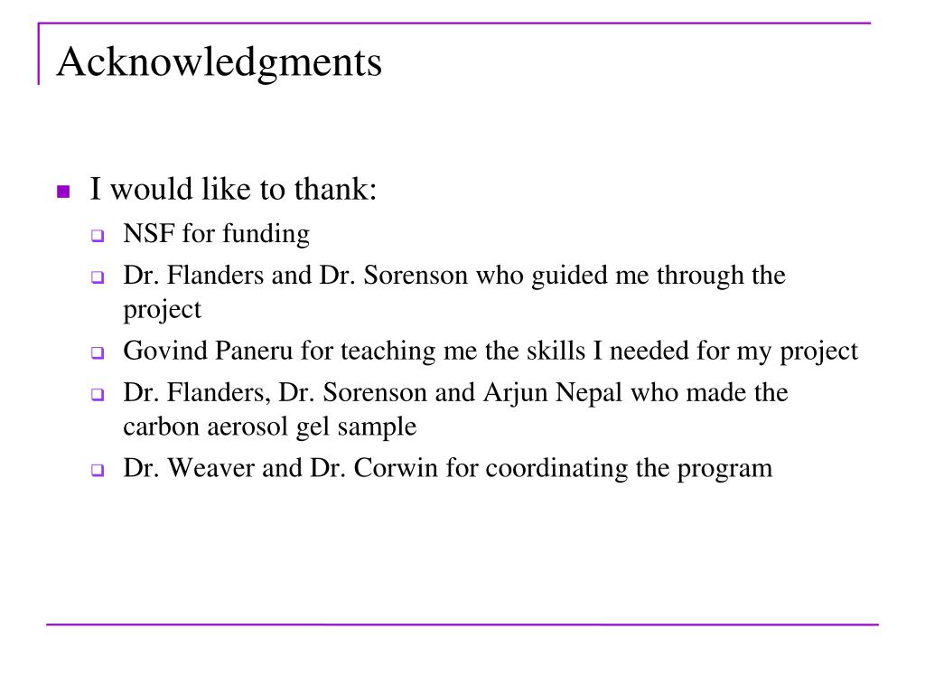 Acknowledgments • I would like to thank: • NSF for funding • Dr. Flanders and Dr. Sorenson who guided me through the project • Govind Paneru for teaching me the skills I needed for my project • Dr. Flanders, Dr. Sorenson and Arjun Nepal who made the carbon aerosol gel sample • Dr. Weaver and Dr. Corwin for coordinating the program