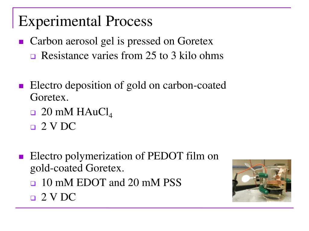 Experimental Process • Carbon aerosol gel is pressed on Goretex • Resistance varies from 25 to 3 kilo ohms • Electro deposition of gold on carbon-coated Goretex. • 20 mM HAuCl4 • 2 V DC • Electro polymerization of PEDOT film on gold-coated Goretex. • 10 mM EDOT and 20 mM PSS • 2 V DC