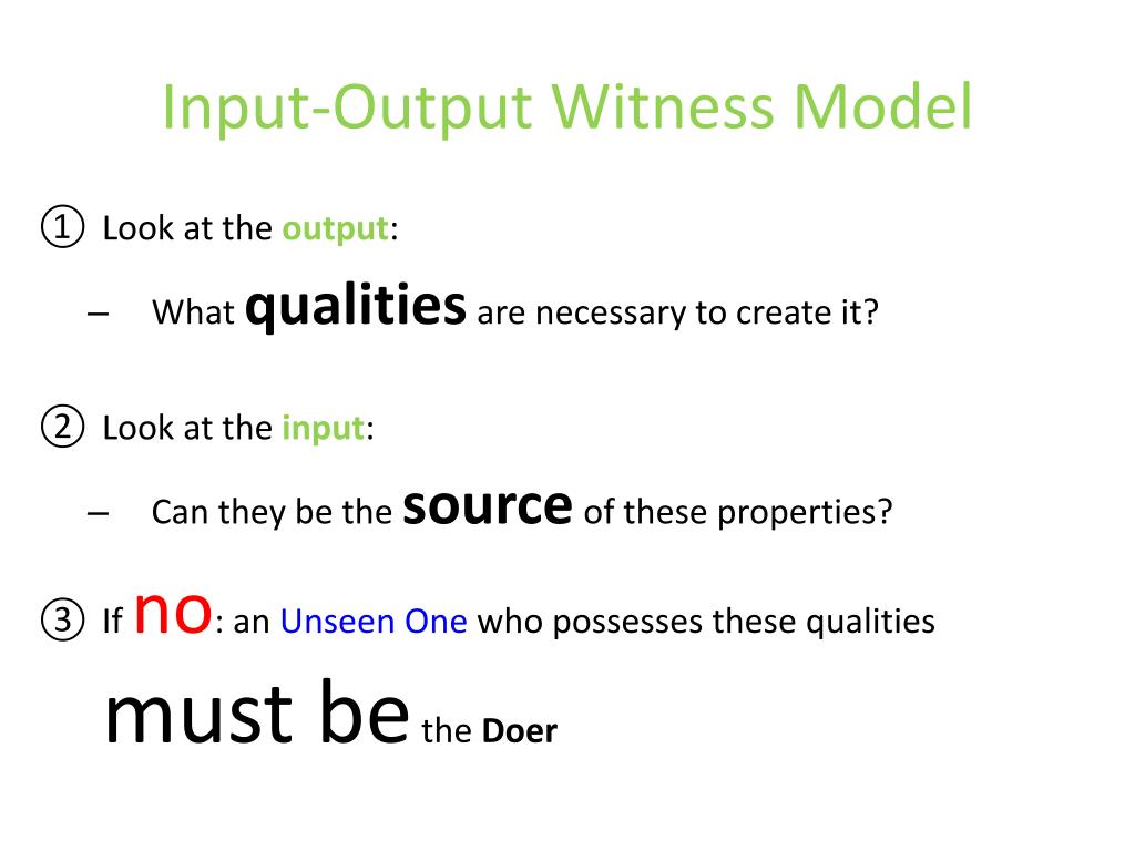 Input-Output Witness Model • Look at the output: • What qualities are necessary to create it? • Look at the input: • Can they be the source of these properties? • If no: an Unseen Onewho possesses these qualities must be the Doer