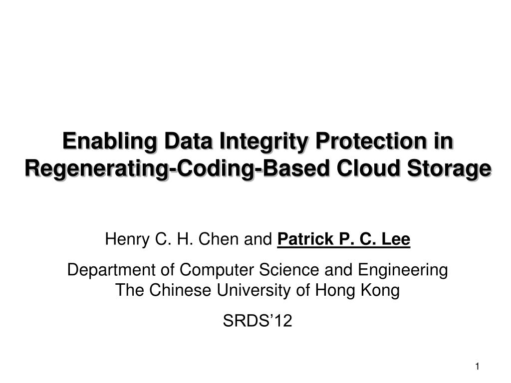 Enabling Data Integrity Protection inRegenerating-Coding-Based Cloud Storage Henry C. H. Chen and Patrick P. C. Lee Department of Computer Science and EngineeringThe Chinese University of Hong Kong SRDS’12