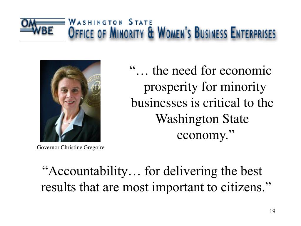 “… the need for economic prosperity for minority businesses is critical to the Washington State economy.” Governor Christine Gregoire “Accountability… for delivering the best results that are most important to citizens.”