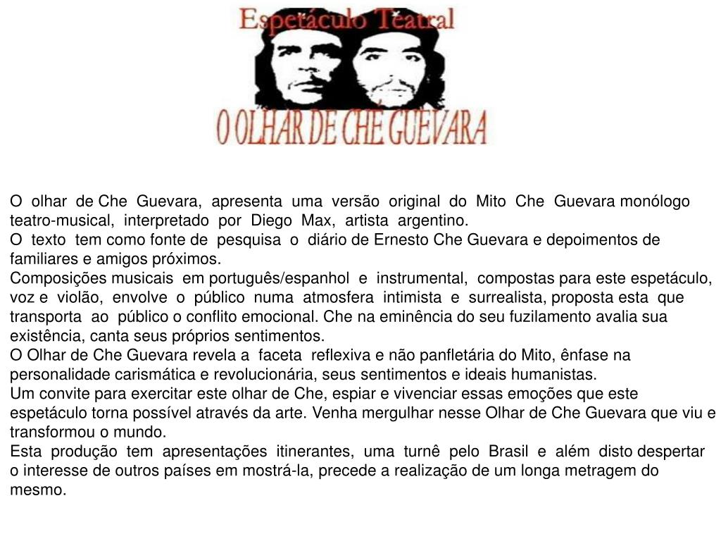 O olhar de Che Guevara, apresenta uma versão original do Mito Che Guevara monólogo teatro-musical, interpretado por Diego Max, artista argentino. O texto tem como fonte de pesquisa o diário de Ernesto Che Guevara e depoimentos de familiares e amigos próximos.Composições musicais em português/espanhol e instrumental, compostas para este espetáculo, voz e violão, envolve o público numa atmosfera intimista e surrealista, proposta esta que transporta ao público o conflito emocional. Che na eminência do seu fuzilamento avalia sua existência, canta seus próprios sentimentos.O Olhar de Che Guevara revela a faceta reflexiva e não panfletária do Mito, ênfase na personalidade carismática e revolucionária, seus sentimentos e ideais humanistas.Um convite para exercitar este olhar de Che, espiar e vivenciar essas emoções que este espetáculo torna possível através da arte. Venha mergulhar nesse Olhar de Che Guevara que viu e transformou o mundo.Esta produção tem apresentações itinerantes, uma turnê pelo Brasil e além disto despertar o interesse de outros países em mostrá-la, precede a realização de um longa metragem do mesmo.