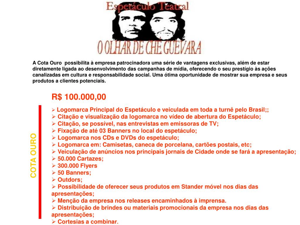 A Cota Ouro possibilita à empresa patrocinadora uma série de vantagens exclusivas, além de estar diretamente ligada ao desenvolvimento das campanhas de mídia, oferecendo o seu prestígio às ações canalizadas em cultura e responsabilidade social. Uma ótima oportunidade de mostrar sua empresa e seus produtos a clientes potenciais. R$ 100.000,00 • Logomarca Principal do Espetáculo e veiculada em toda a turnê pelo Brasil;; • Citação e visualização da logomarca no vídeo de abertura do Espetáculo; • Citação, se possível, nas entrevistas em emissoras de TV; • Fixação de até 03 Banners no local do espetáculo; • Logomarca nos CDs e DVDs do espetáculo; • Logomarca em: Camisetas, caneca de porcelana, cartões postais, etc; • Veiculação de anúncios nos principais jornais de Cidade onde se fará a apresentação; • 50.000 Cartazes; • 300.000 Flyers • 50 Banners; • Outdors; • Possibilidade de oferecer seus produtos em Stander móvel nos dias das apresentações; • Menção da empresa nos releases encaminhados à imprensa. • Distribuição de brindes ou materiais promocionais da empresa nos dias das apresentações; • Cortesias a combinar. COTA OURO