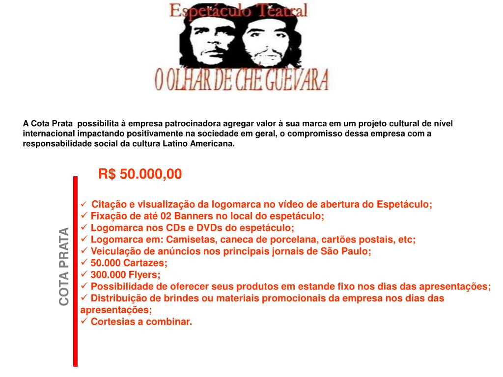 A Cota Prata possibilita à empresa patrocinadora agregar valor à sua marca em um projeto cultural de nível internacional impactando positivamente na sociedade em geral, o compromisso dessa empresa com a responsabilidade social da cultura Latino Americana. R$ 50.000,00 • Citação e visualização da logomarca no vídeo de abertura do Espetáculo; • Fixação de até 02 Banners no local do espetáculo; • Logomarca nos CDs e DVDs do espetáculo; • Logomarca em: Camisetas, caneca de porcelana, cartões postais, etc; • Veiculação de anúncios nos principais jornais de São Paulo; • 50.000 Cartazes; • 300.000 Flyers; • Possibilidade de oferecer seus produtos em estande fixo nos dias das apresentações; • Distribuição de brindes ou materiais promocionais da empresa nos dias das apresentações; • Cortesias a combinar. COTA PRATA
