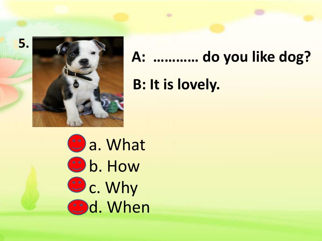A: ………… do you like dog? 5. B: It is lovely. a. Whatb. How c. Why d. When