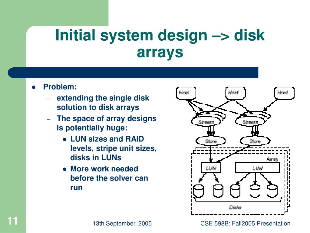 Initial system design –> disk arrays • Problem: • extending the single disk solution to disk arrays • The space of array designs is potentially huge: • LUN sizes and RAID levels, stripe unit sizes, disks in LUNs • More work needed before the solver can run CSE 598B: Fall2005 Presentation