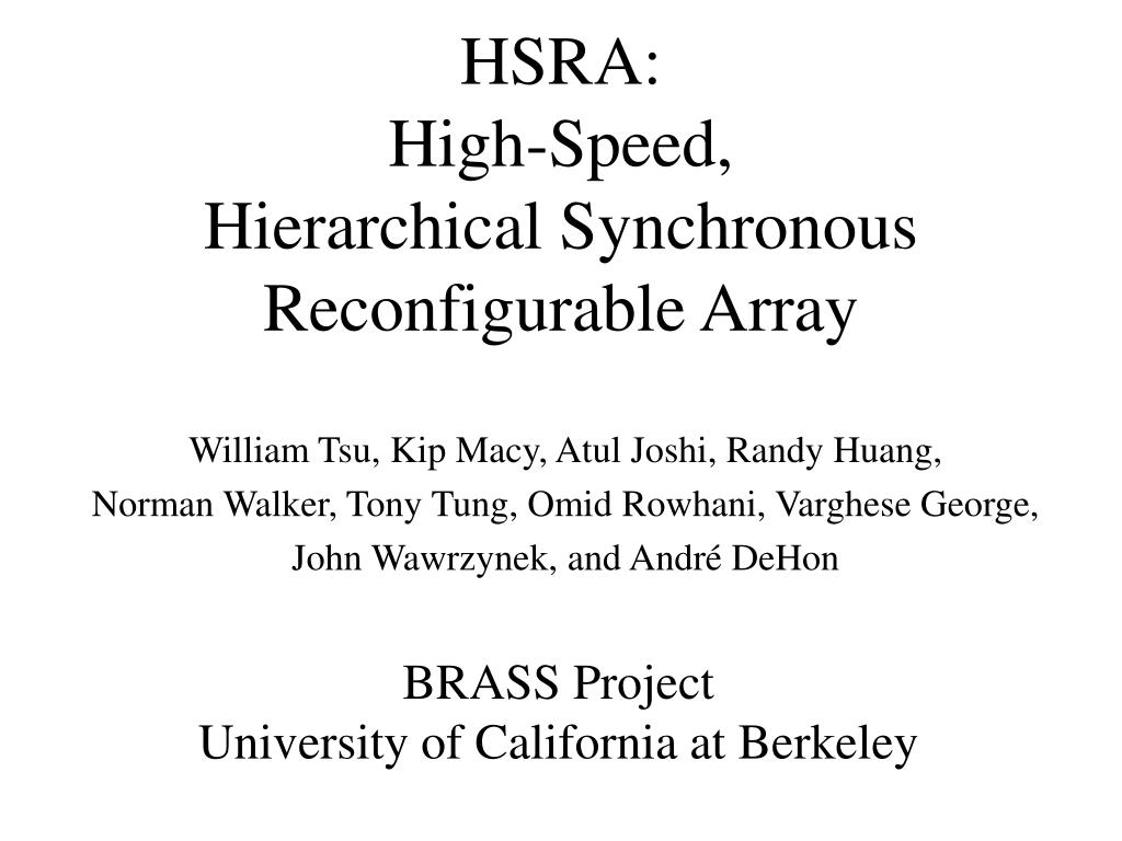 HSRA:High-Speed, Hierarchical Synchronous Reconfigurable Array William Tsu, Kip Macy, Atul Joshi, Randy Huang, Norman Walker, Tony Tung, Omid Rowhani, Varghese George, John Wawrzynek, and André DeHon BRASS Project University of California at Berkeley