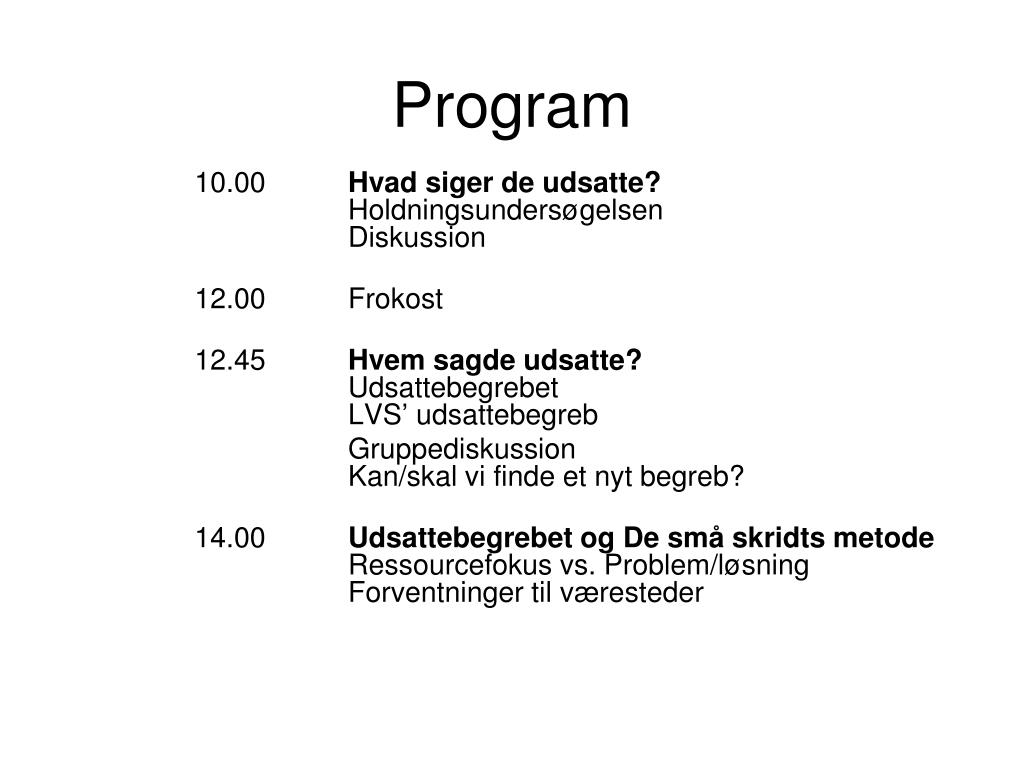 Program 10.00 Hvad siger de udsatte?Holdningsundersøgelsen Diskussion 12.00 Frokost 12.45 Hvem sagde udsatte?Udsattebegrebet LVS’ udsattebegreb Gruppediskussion Kan/skal vi finde et nyt begreb? 14.00 Udsattebegrebet og De små skridts metode Ressourcefokus vs. Problem/løsning Forventninger til væresteder