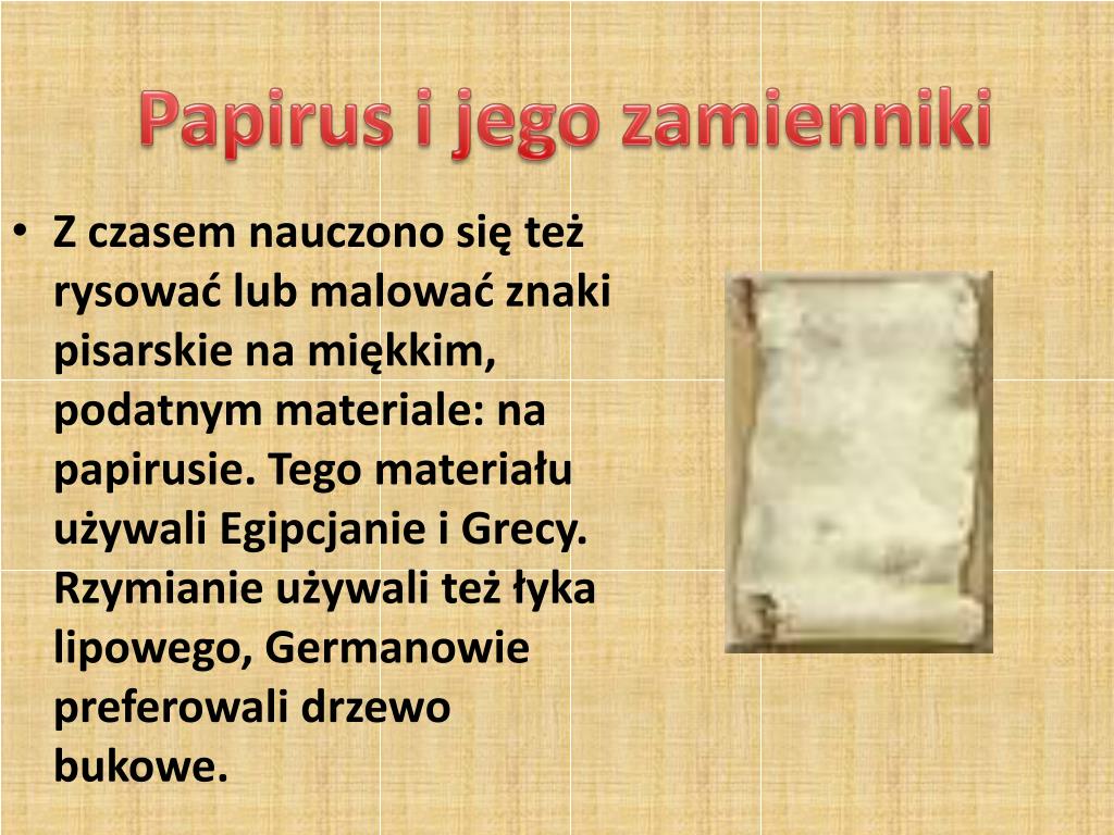 Papirus i jego zamienniki • Z czasem nauczono się też rysować lub malować znaki pisarskie na miękkim, podatnym materiale: na papirusie. Tego materiału używali Egipcjanie i Grecy. Rzymianie używali też łyka lipowego, Germanowie preferowali drzewo bukowe.