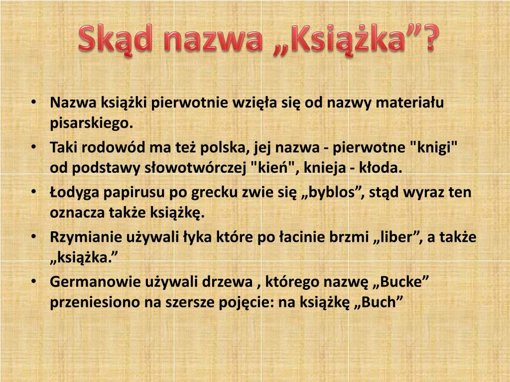Skąd nazwa „Książka”? • Nazwa książki pierwotnie wzięła się od nazwy materiału pisarskiego. • Taki rodowód ma też polska, jej nazwa - pierwotne "knigi" od podstawy słowotwórczej "kień", knieja - kłoda. • Łodyga papirusu po grecku zwie się „byblos”, stąd wyraz ten oznacza także książkę. • Rzymianie używali łyka które po łacinie brzmi „liber”, a także „książka.” • Germanowie używali drzewa , którego nazwę „Bucke” przeniesiono na szersze pojęcie: na książkę „Buch”