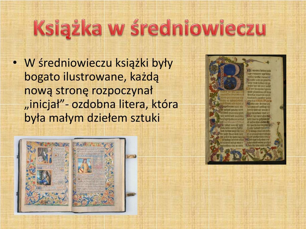 Książka w średniowieczu • W średniowieczu książki były bogato ilustrowane, każdą nową stronę rozpoczynał „inicjał”- ozdobna litera, która była małym dziełem sztuki
