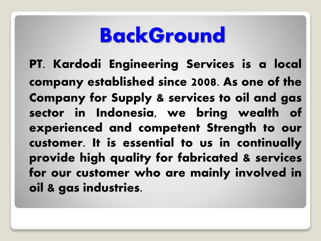 PT. Kardodi Engineering Services is a local company established since 2008. As one of the Company for Supply & services to oil and gas sector in Indonesia, we bring wealth of experienced and competent Strength to our customer. It is essential to us in continually provide high quality for fabricated & services for our customer who are mainly involved in oil & gas industries. BackGround