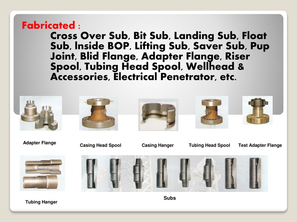 Fabricated : Cross Over Sub, Bit Sub, Landing Sub, Float Sub, lnside BOP, Lifting Sub, Saver Sub, Pup Joint, Blid Flange, Adapter Flange, Riser Spool, Tubing Head Spool, Wellhead & Accessories, Electrical Penetrator, etc. Adapter Flange Casing Head Spool Casing Hanger Tubing Head Spool TestAdapter Flange Subs Tubing Hanger