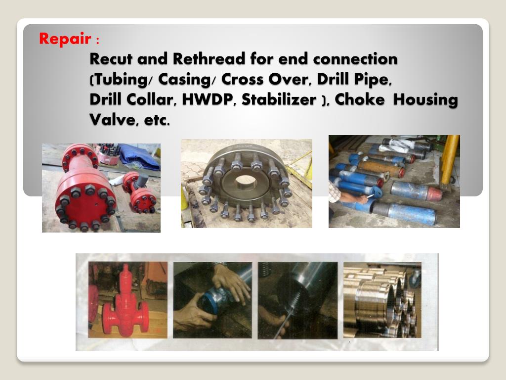 Repair :Recut and Rethread for end connection (Tubing/ Casing/ Cross Over, Drill Pipe, Drill Collar, HWDP, Stabilizer ), Choke Housing Valve, etc.