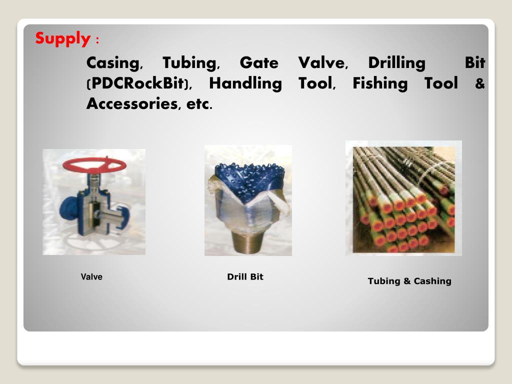 Supply : Casing, Tubing, Gate Valve, Drilling Bit (PDCRockBit), Handling Tool, Fishing Tool & Accessories, etc. Valve Drill Bit Tubing & Cashing