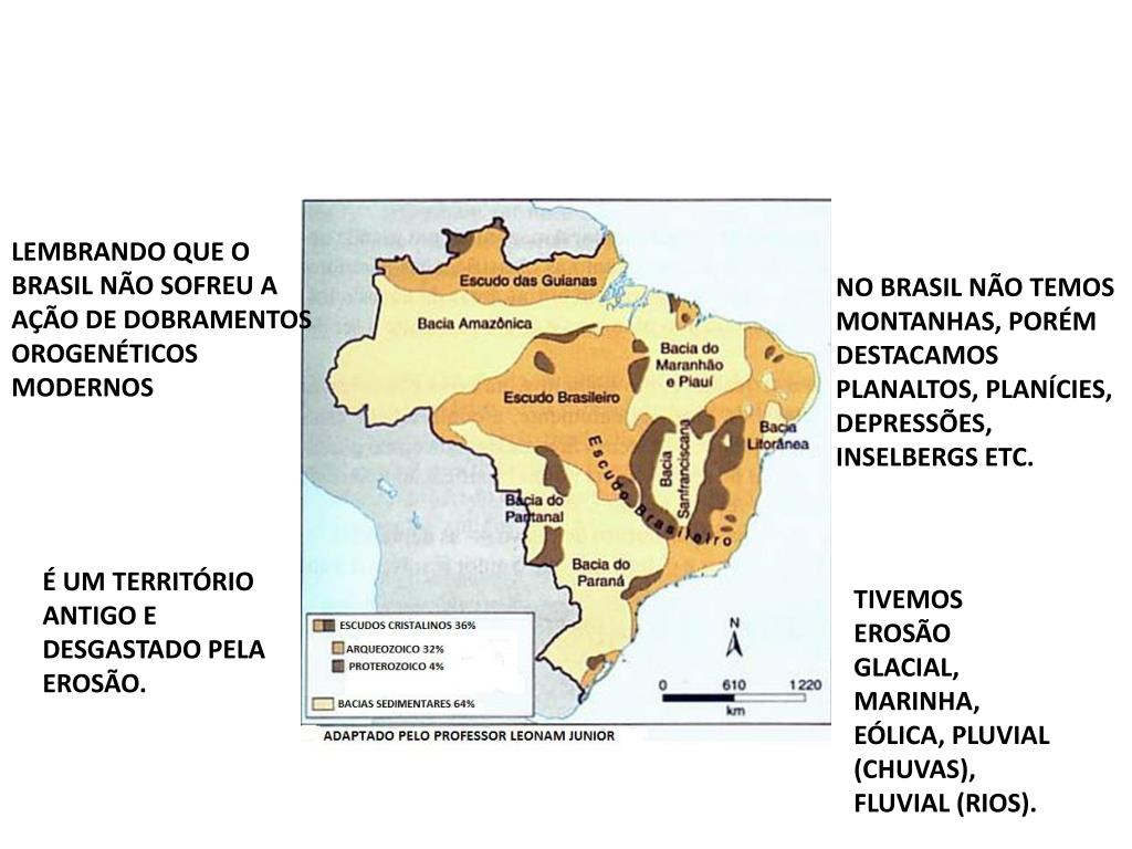 LEMBRANDO QUE O BRASIL NÃO SOFREU A AÇÃO DE DOBRAMENTOS OROGENÉTICOS MODERNOS NO BRASIL NÃO TEMOS MONTANHAS, PORÉM DESTACAMOS PLANALTOS, PLANÍCIES, DEPRESSÕES, INSELBERGS ETC. É UM TERRITÓRIO ANTIGO E DESGASTADO PELA EROSÃO. TIVEMOS EROSÃO GLACIAL, MARINHA, EÓLICA, PLUVIAL (CHUVAS), FLUVIAL (RIOS).