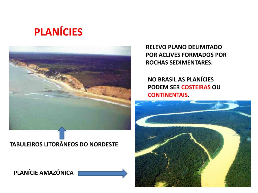 PLANÍCIES RELEVO PLANO DELIMITADO POR ACLIVES FORMADOS POR ROCHAS SEDIMENTARES. NO BRASIL AS PLANÍCIES PODEM SER COSTEIRAS OU CONTINENTAIS. TABULEIROS LITORÂNEOS DO NORDESTE PLANÍCIE AMAZÔNICA
