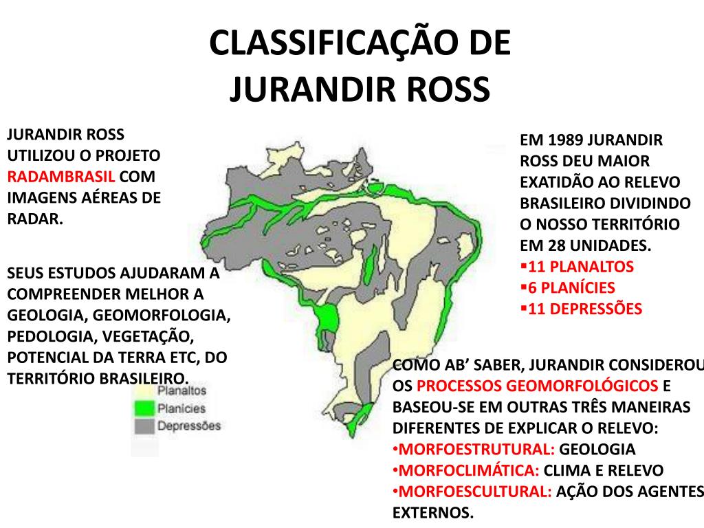 CLASSIFICAÇÃO DE JURANDIR ROSS JURANDIR ROSS UTILIZOU O PROJETO RADAMBRASIL COM IMAGENS AÉREAS DE RADAR. • EM 1989 JURANDIR ROSS DEU MAIOR EXATIDÃO AO RELEVO BRASILEIRO DIVIDINDO O NOSSO TERRITÓRIO EM 28 UNIDADES. • 11 PLANALTOS • 6 PLANÍCIES • 11 DEPRESSÕES SEUS ESTUDOS AJUDARAM A COMPREENDER MELHOR A GEOLOGIA, GEOMORFOLOGIA, PEDOLOGIA, VEGETAÇÃO, POTENCIAL DA TERRA ETC, DO TERRITÓRIO BRASILEIRO. • COMO AB’ SABER, JURANDIR CONSIDEROU OS PROCESSOS GEOMORFOLÓGICOS E BASEOU-SE EM OUTRAS TRÊS MANEIRAS DIFERENTES DE EXPLICAR O RELEVO: • MORFOESTRUTURAL: GEOLOGIA • MORFOCLIMÁTICA: CLIMA E RELEVO • MORFOESCULTURAL: AÇÃO DOS AGENTES EXTERNOS.