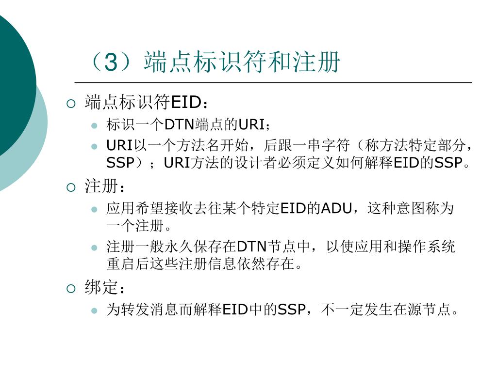 (3)端点标识符和注册 • 端点标识符EID: • 标识一个DTN端点的URI; • URI以一个方法名开始,后跟一串字符(称方法特定部分,SSP);URI方法的设计者必须定义如何解释EID的SSP。 • 注册: • 应用希望接收去往某个特定EID的ADU,这种意图称为一个注册。 • 注册一般永久保存在DTN节点中,以使应用和操作系统重启后这些注册信息依然存在。 • 绑定: • 为转发消息而解释EID中的SSP,不一定发生在源节点。