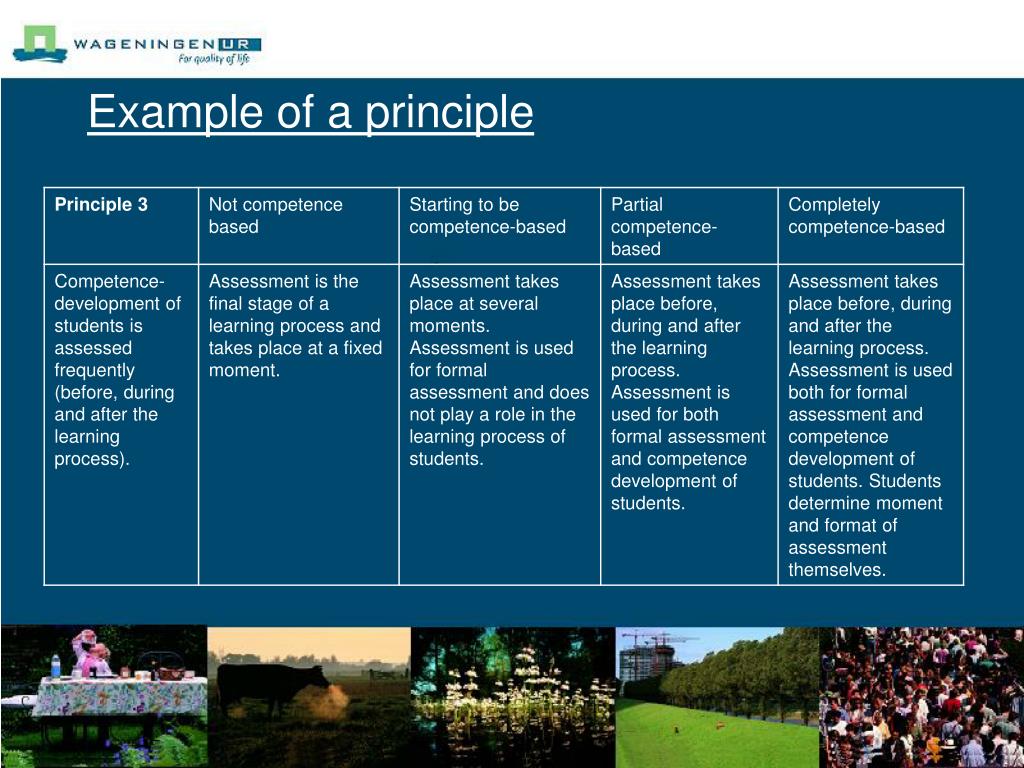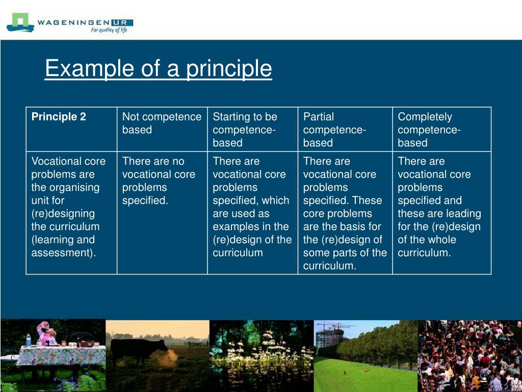 Principles for CBL • The competencies that are basis for the curriculum are defined. • Vocational core problems are the organising unit for (re)designing the curriculum. • Competence-development of students is assessed frequently (before, during and after the learning process). • Learning activities take place in several authentic situations. • In learning and assessment processes knowledge, skills and attitudes are integrated. • Self-responsibility and (self)reflection of students are stimulated. • Teachers both in schools and practice fulfil their roles as coach and expert in balance. • A basis is realised for a lifelong learning attitude for students.