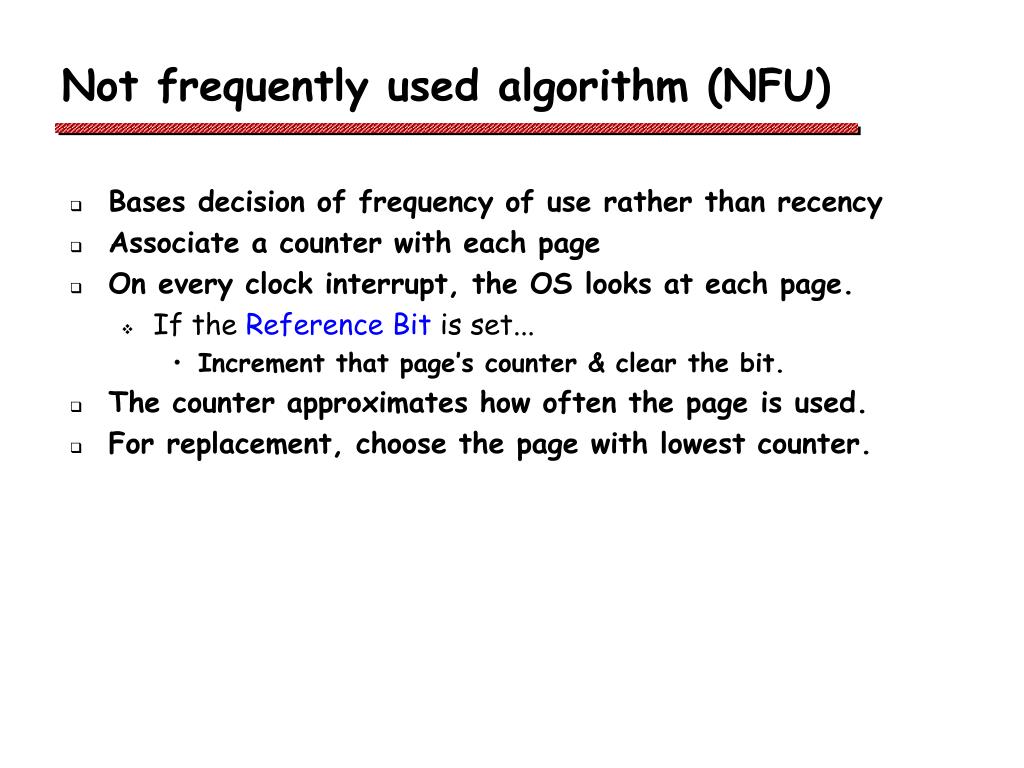 Not frequently used algorithm (NFU) • Bases decision of frequency of use rather than recency • Associate a counter with each page • On every clock interrupt, the OS looks at each page. • If the Reference Bit is set... • Increment that page’s counter & clear the bit. • The counter approximates how often the page is used. • For replacement, choose the page with lowest counter.