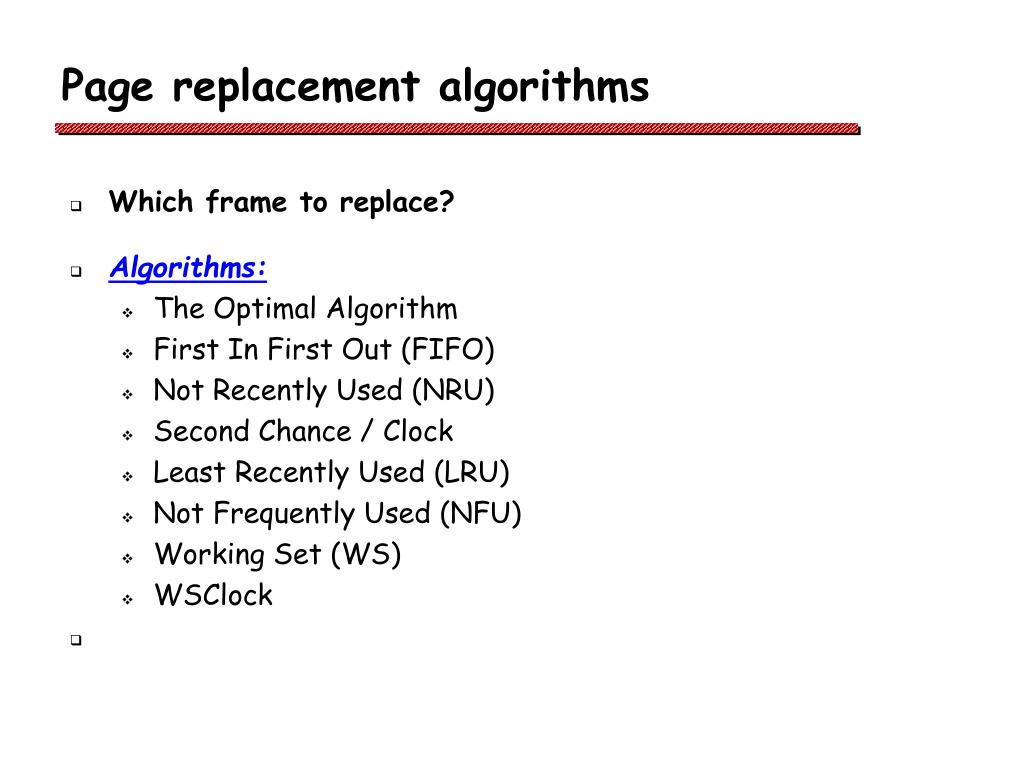 Page replacement algorithms • Which frame to replace? • Algorithms: • The Optimal Algorithm • First In First Out (FIFO) • Not Recently Used (NRU) • Second Chance / Clock • Least Recently Used (LRU) • Not Frequently Used (NFU) • Working Set (WS) • WSClock