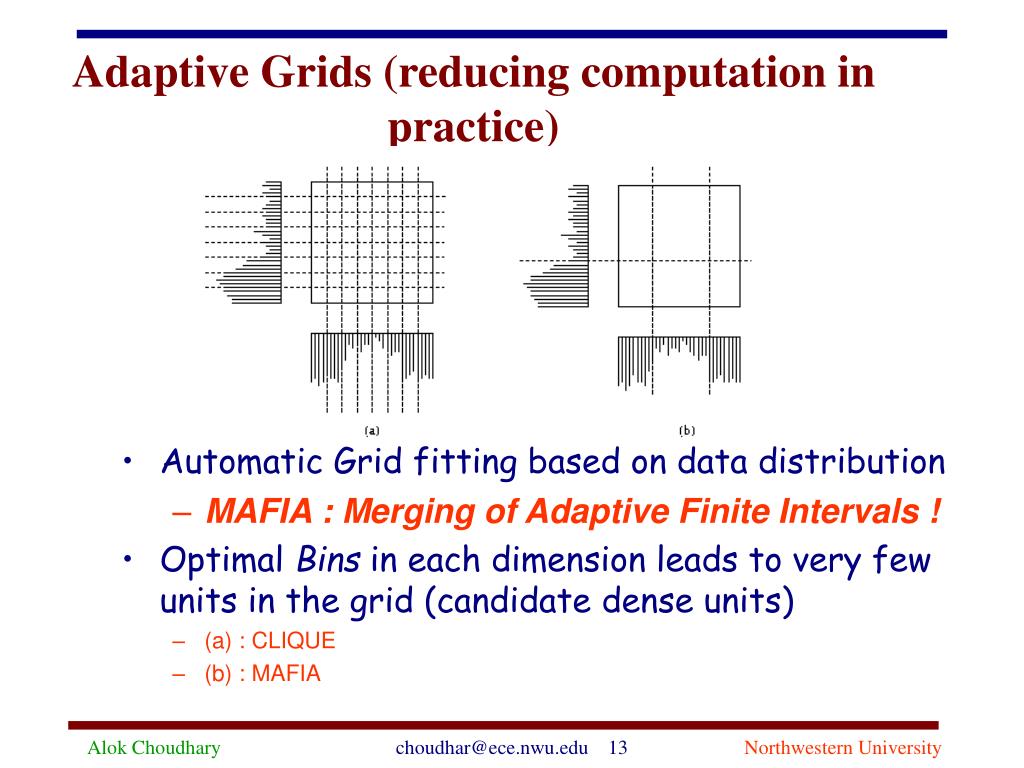 Automatic Grid fitting based on data distribution MAFIA : Merging of Adaptive Finite Intervals ! Optimal Bins in each dimension leads to very few units in the grid (candidate dense units) (a) : CLIQUE (b) : MAFIA Adaptive Grids (reducing computation in practice) choudhar@ece.nwu.edu 13