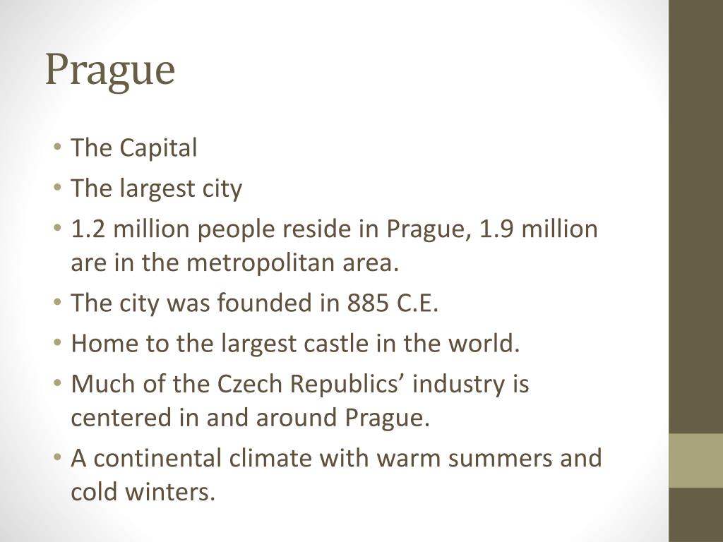 Prague • The Capital • The largest city • 1.2 million people reside in Prague, 1.9 million are in the metropolitan area. • The city was founded in 885 C.E. • Home to the largest castle in the world. • Much of the Czech Republics’ industry is centered in and around Prague. • A continental climate with warm summers and cold winters.