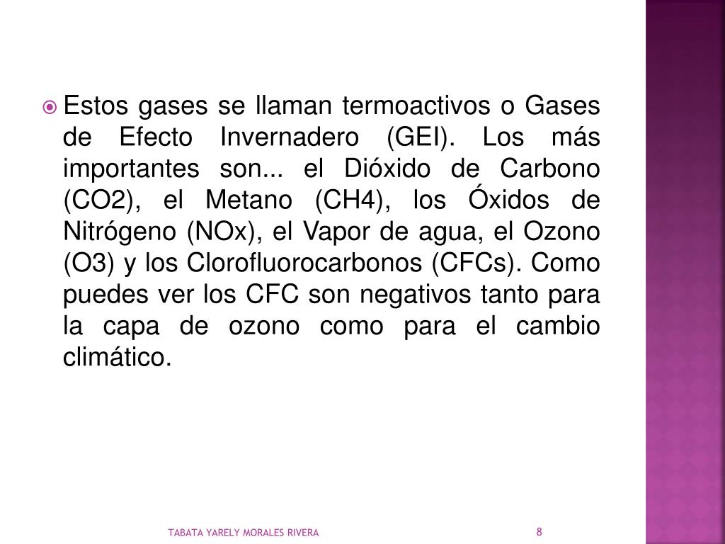 Estos gases se llaman termoactivos o Gases de Efecto Invernadero (GEI). Los más importantes son... el Dióxido de Carbono (CO2), el Metano (CH4), los Óxidos de Nitrógeno (NOx), el Vapor de agua, el Ozono (O3) y los Clorofluorocarbonos (CFCs). Como puedes ver los CFC son negativos tanto para la capa de ozono como para el cambio climático. TABATA YARELY MORALES RIVERA